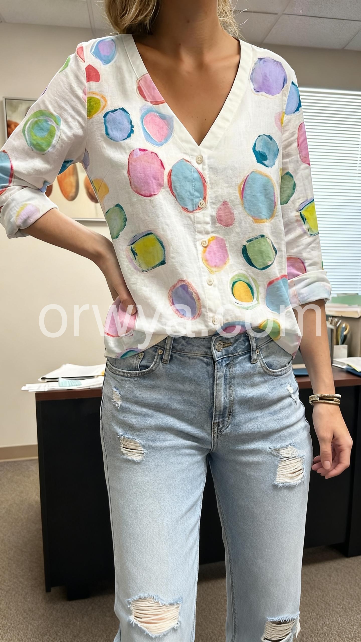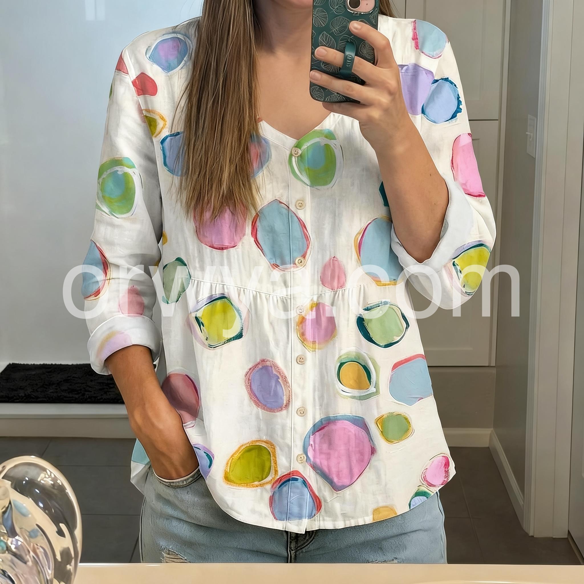 This blouse features a vibrant watercolor-style polka dot print on a soft white base. The relaxed fit and button-down front add casual charm. Rolled sleeves and side pockets enhance comfort. Perfect for pairing with jeans or shorts. Ideal for spring and summer days.