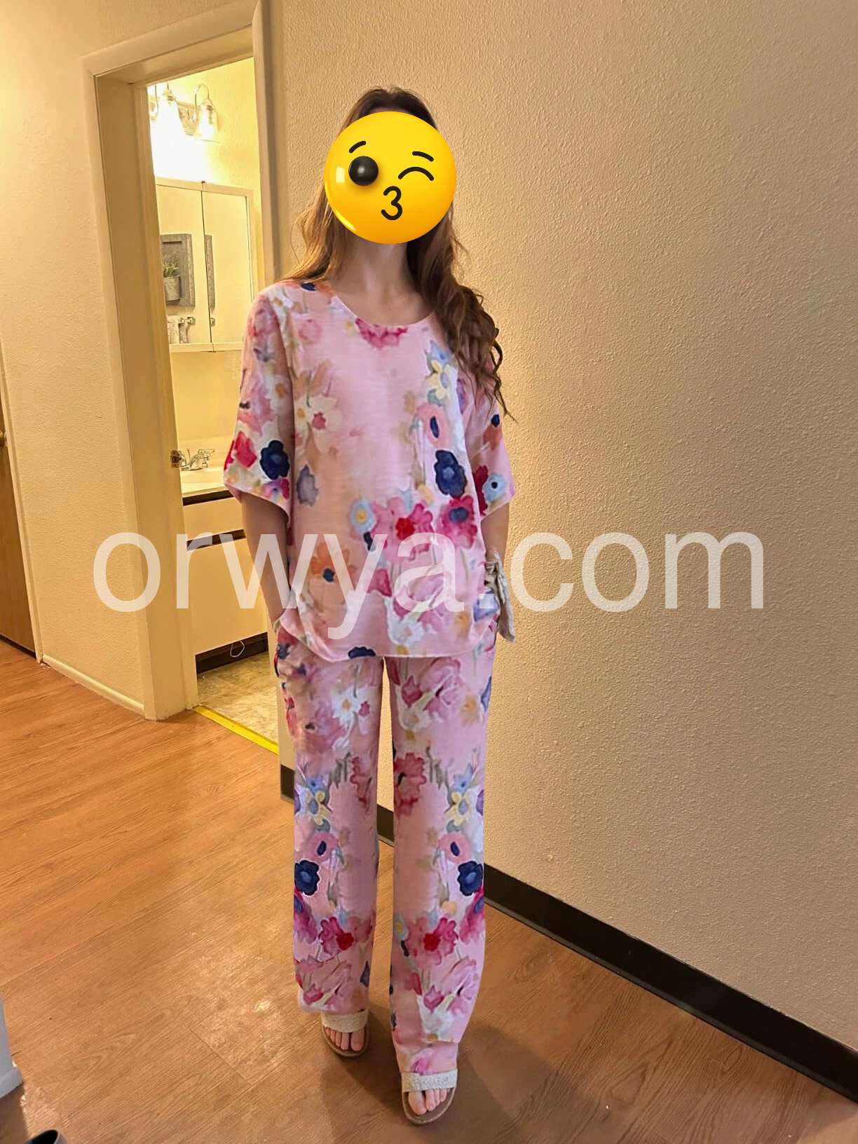 This floral two-piece set features a soft pink base with vibrant watercolor blooms in red, blue, and yellow. The relaxed-fit top has short flutter sleeves and a round neckline. Matching wide-leg pants offer comfort and ease. Perfect for casual outings or warm-weather days. Lightweight fabric ensures breathability and effortless style.