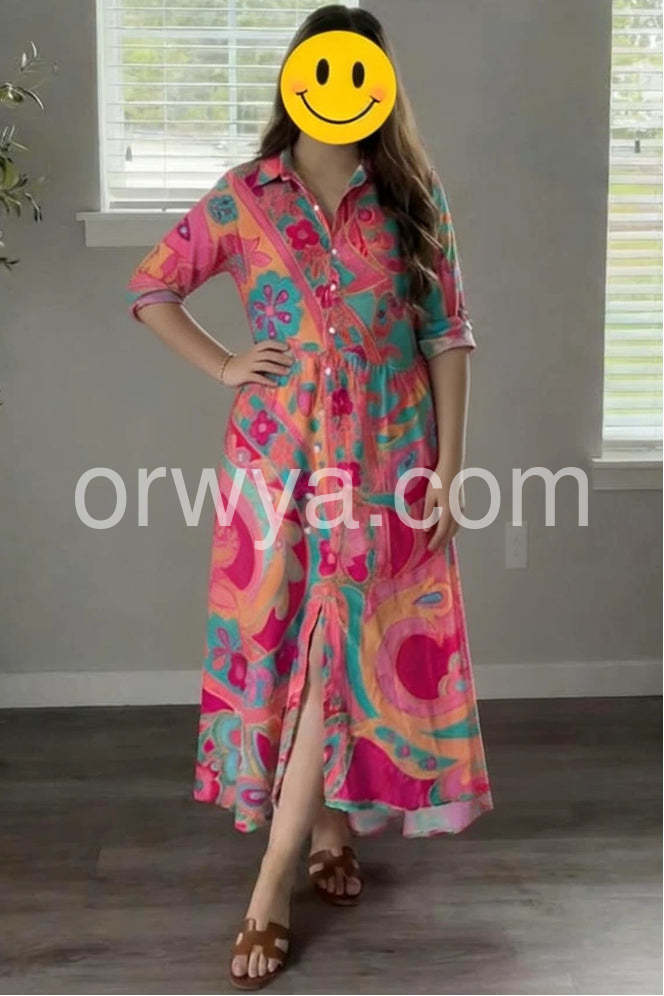 Make a statement in this Vibrant Pink Collared Floral Print Midi Dress, a bold and eye-catching shirt dress that brings the energy of tropical paradise to your wardrobe. Crafted from lightweight, flowy fabric—likely rayon or cotton blend—this maxi dress features a lively all-over print combining swirling paisley patterns, bright pink flowers, and teal accents on a soft peach background, creating a joyful and artistic aesthetic. The classic button-down front and pointed collar give it a polished, shirt-style silhouette, while the high-low hemline adds movement and flair. Three-quarter sleeves with rolled cuffs offer a relaxed fit perfect for warm days, and side slits enhance comfort and ease of motion.