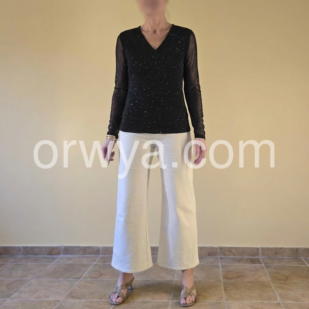 Elevate your wardrobe with this Black Sparkle Sequin V-Neck Long Sleeve Top. Designed with shimmering sequins and a flattering V-neckline, it effortlessly combines sophistication and glamour. The long sleeves provide a balanced silhouette, perfect for evening events or festive occasions. This top delivers both eye-catching style and comfortable wear, making it a versatile choice for any chic ensemble.