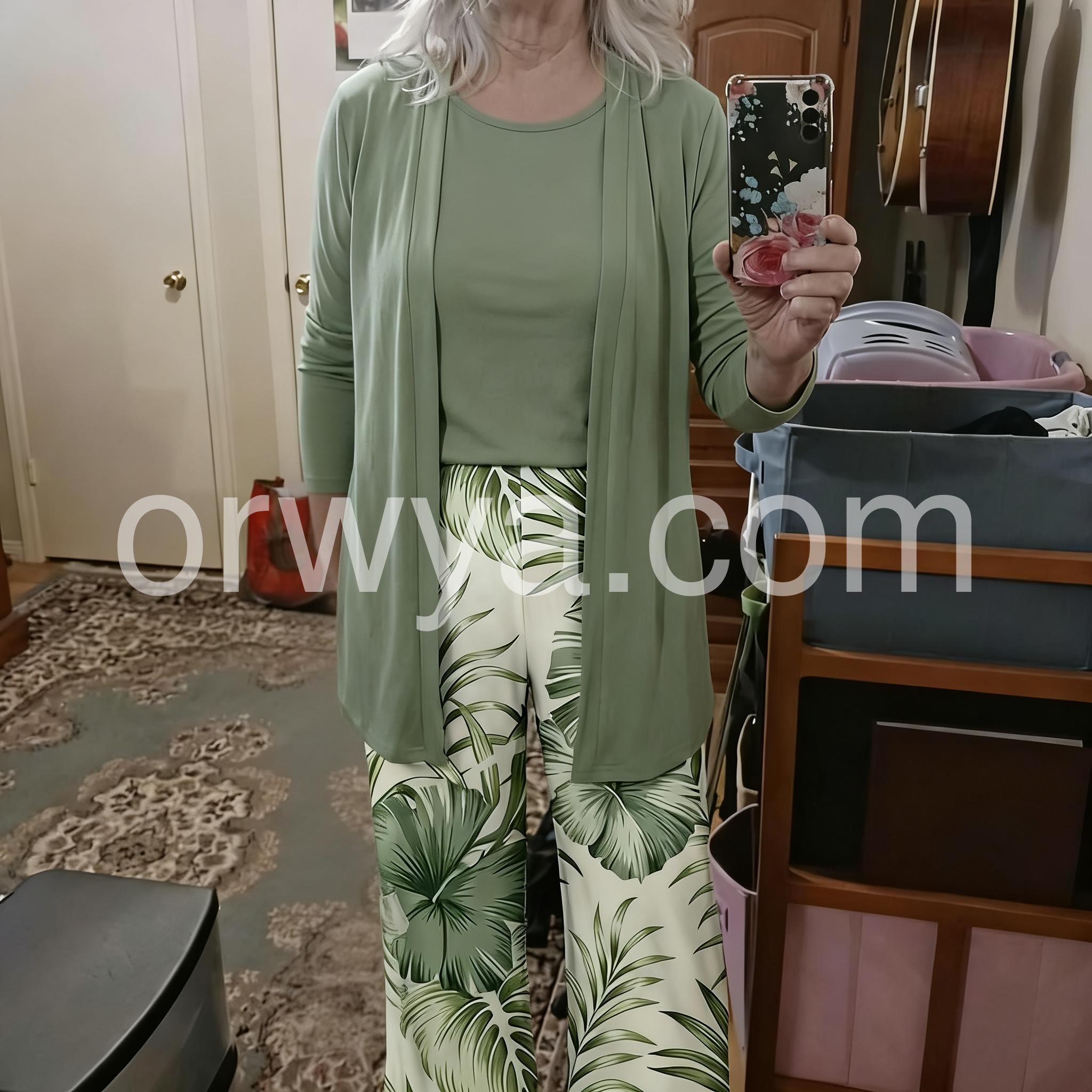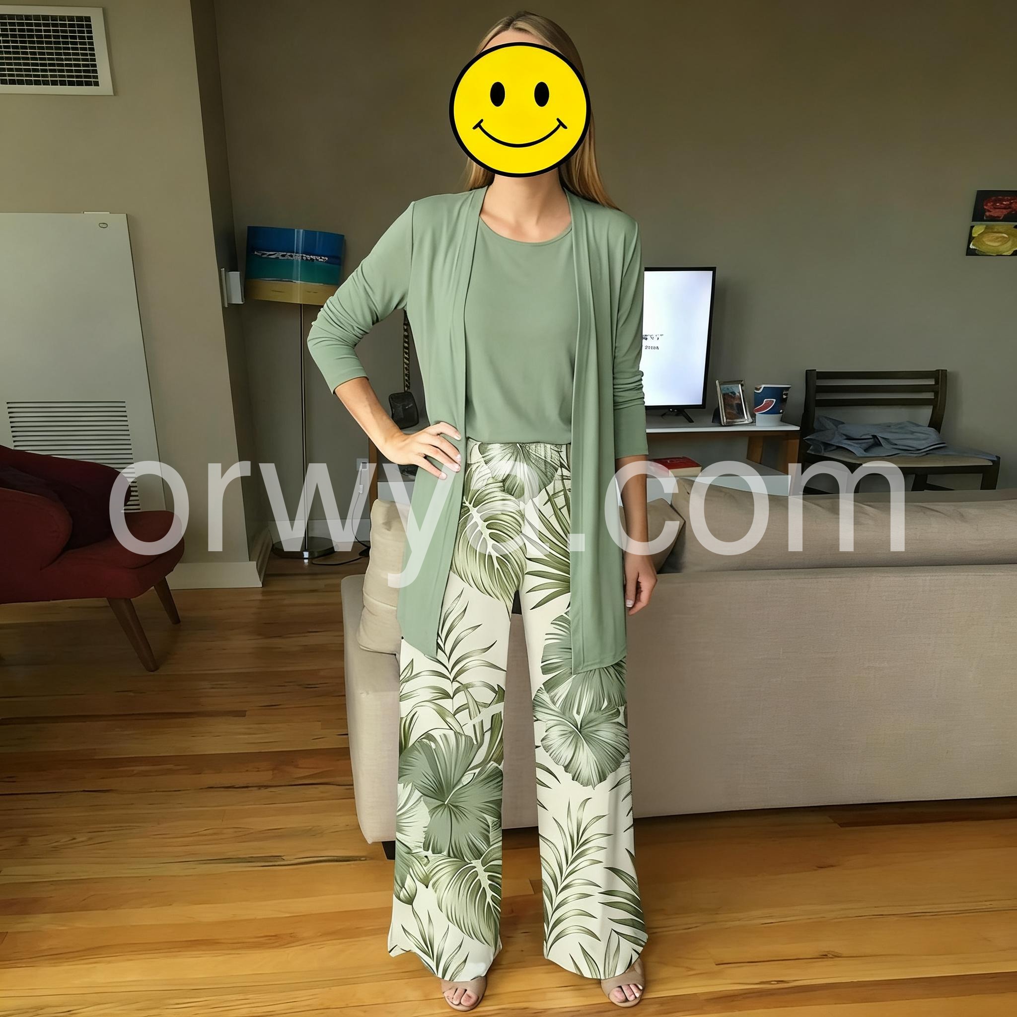 This three-piece set features a soft sage green drape cardigan with a relaxed fit. Paired with wide-leg pants in a leafy tropical print for a fresh, nature-inspired look. Lightweight fabric ensures comfort and breathability. Ideal for casual outings or warm-weather days. Effortlessly chic with a touch of boho elegance.