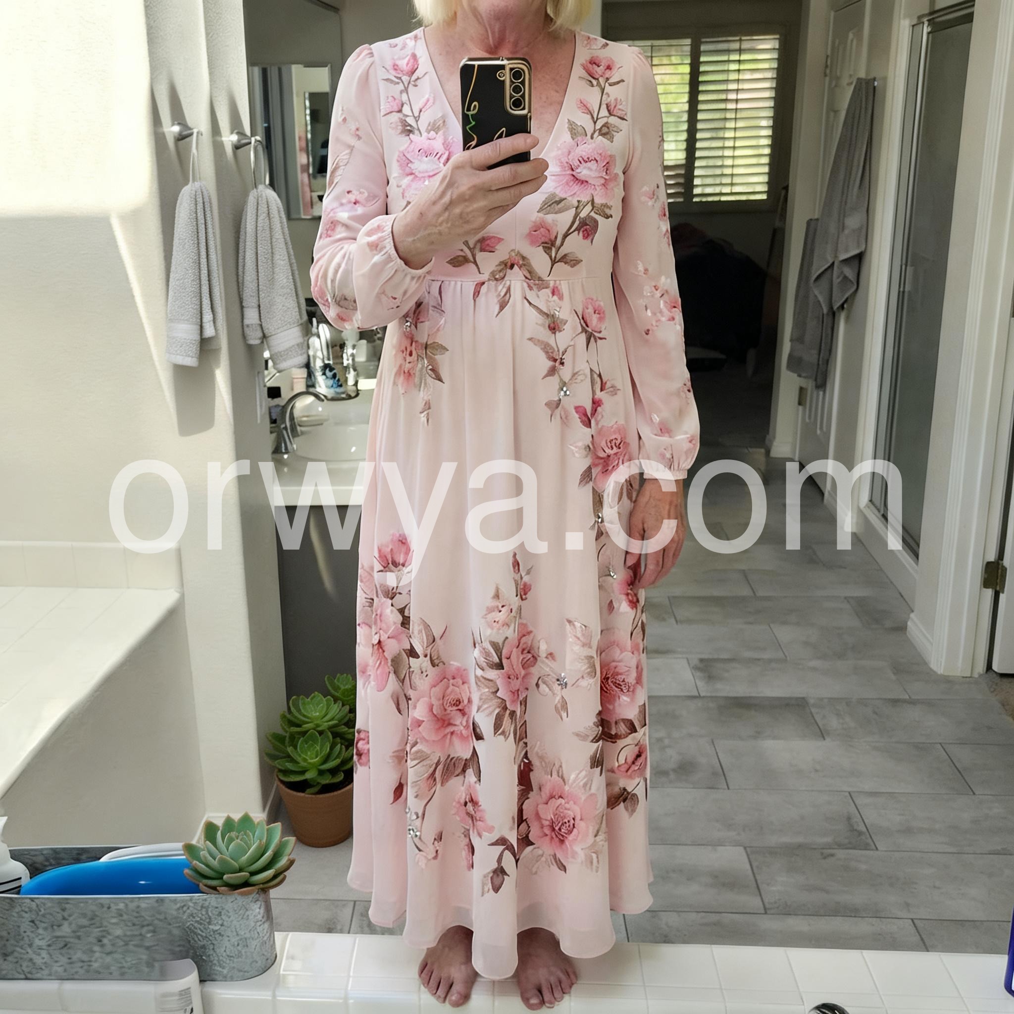 Elevate your wardrobe with this sophisticated maxi dress, featuring an elegant long sleeve silhouette paired with a captivating floral print. The flowing design drapes gracefully to the floor, creating a refined silhouette that transitions seamlessly from daytime occasions to evening events. The romantic aesthetic is enhanced by the intricate botanical pattern, while the long sleeves provide versatile coverage suitable for various seasons and settings. Perfect for those seeking timeless elegance with contemporary appeal.