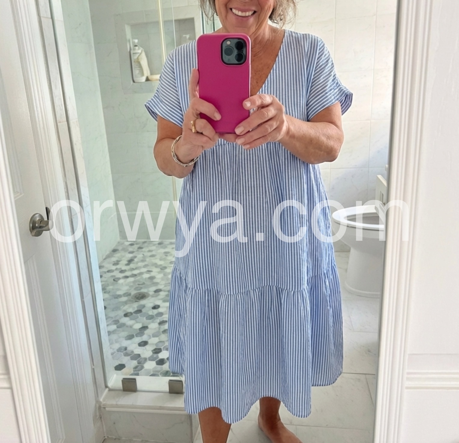 This Youthful Striped Print V-Neck Midi Dress is designed for the modern fashion-forward woman. Made with a flattering V-neckline and eye-catching striped print, this dress is versatile and perfect for any occasion. Its midi length adds a touch of elegance, while the youthful design adds a playful touch. Elevate your wardrobe with this must-have dress.