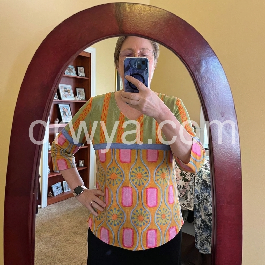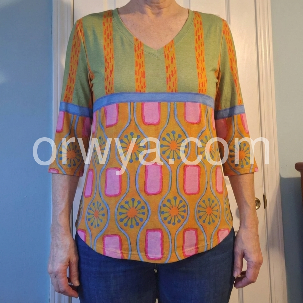 This three-quarter sleeve top features a bold, abstract pattern with geometric and floral motifs. The V-neck design adds a flattering touch. Lightweight fabric perfect for casual wear. Pair with jeans or shorts for a fun, bohemian look. Ideal for warm weather and relaxed outings.