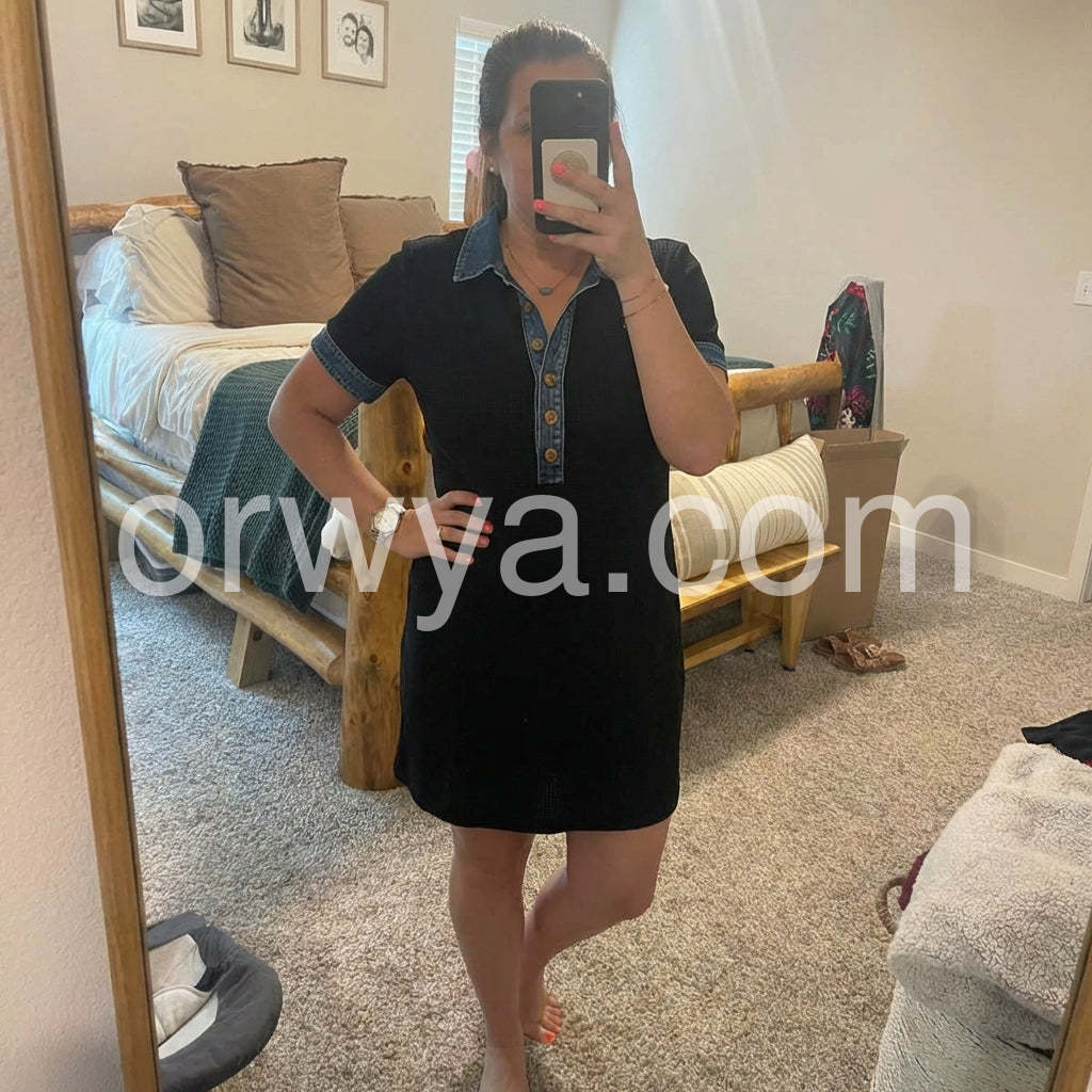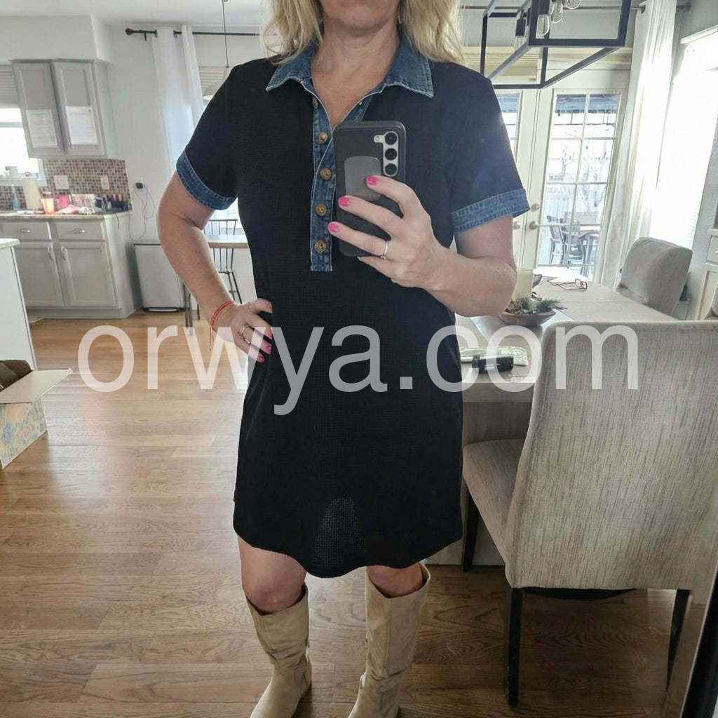 Black Denim Trim Short Sleeve Mini Dress Crafted from premium denim, this mini dress combines timeless style with contemporary silhouette. The short sleeves offer versatile layering options, while the trim detailing adds refined sophistication. Perfect for transitional seasons, this piece transitions effortlessly from casual daytime wear to evening occasions. The structured denim fabric ensures durability and maintains its shape through repeated wear. An essential wardrobe staple that pairs seamlessly with sneakers, boots, or heels for endless styling possibilities.