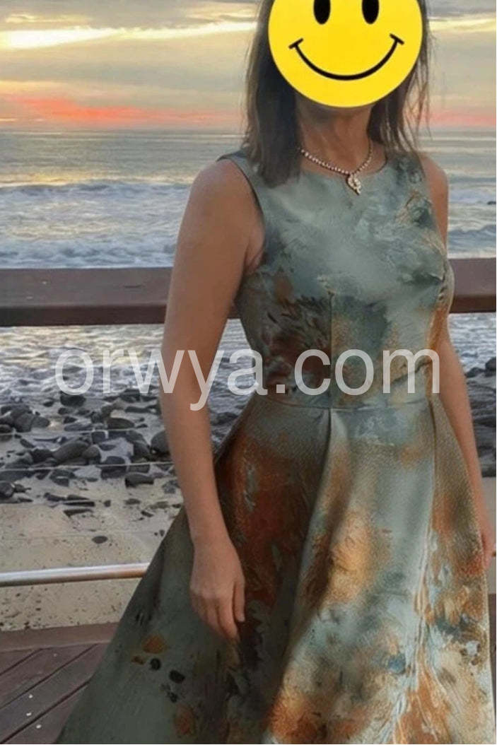 This stunning sleeveless midi dress features a bold abstract print with a harmonious blend of soft blue, earthy rust, and muted gold tones, reminiscent of a watercolor masterpiece. Crafted from luxurious, structured fabric, the dress boasts a flattering high-neck design and a tailored fit through the bodice that elegantly flares into an A-line skirt, creating a graceful silhouette. The mid-calf length adds timeless sophistication, making it perfect for cocktail parties, weddings, or upscale evening events. Paired with delicate heels and a sleek clutch, this dress exudes refined elegance and artistic flair—ideal for those who appreciate fashion with a touch of modern artistry.