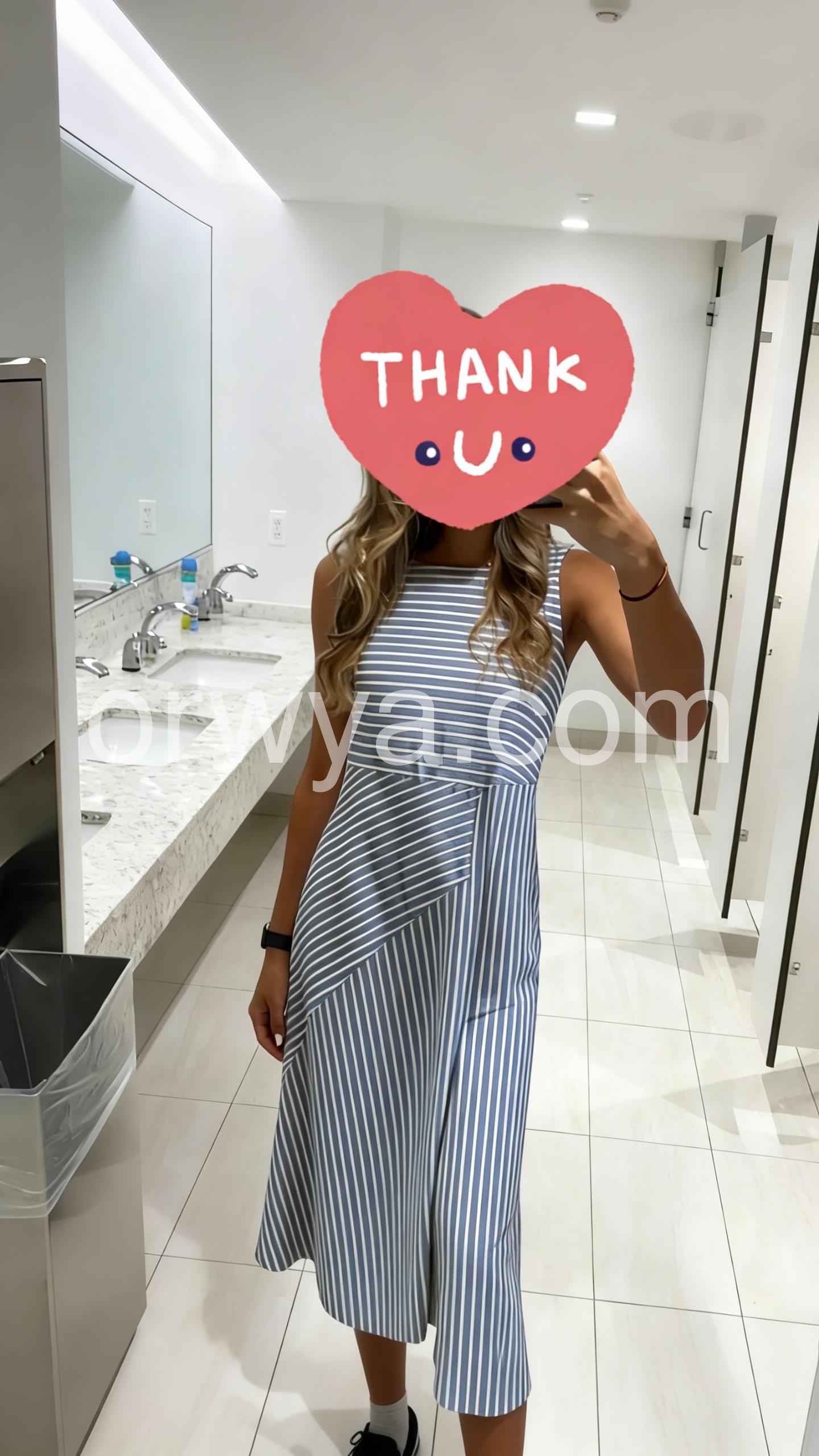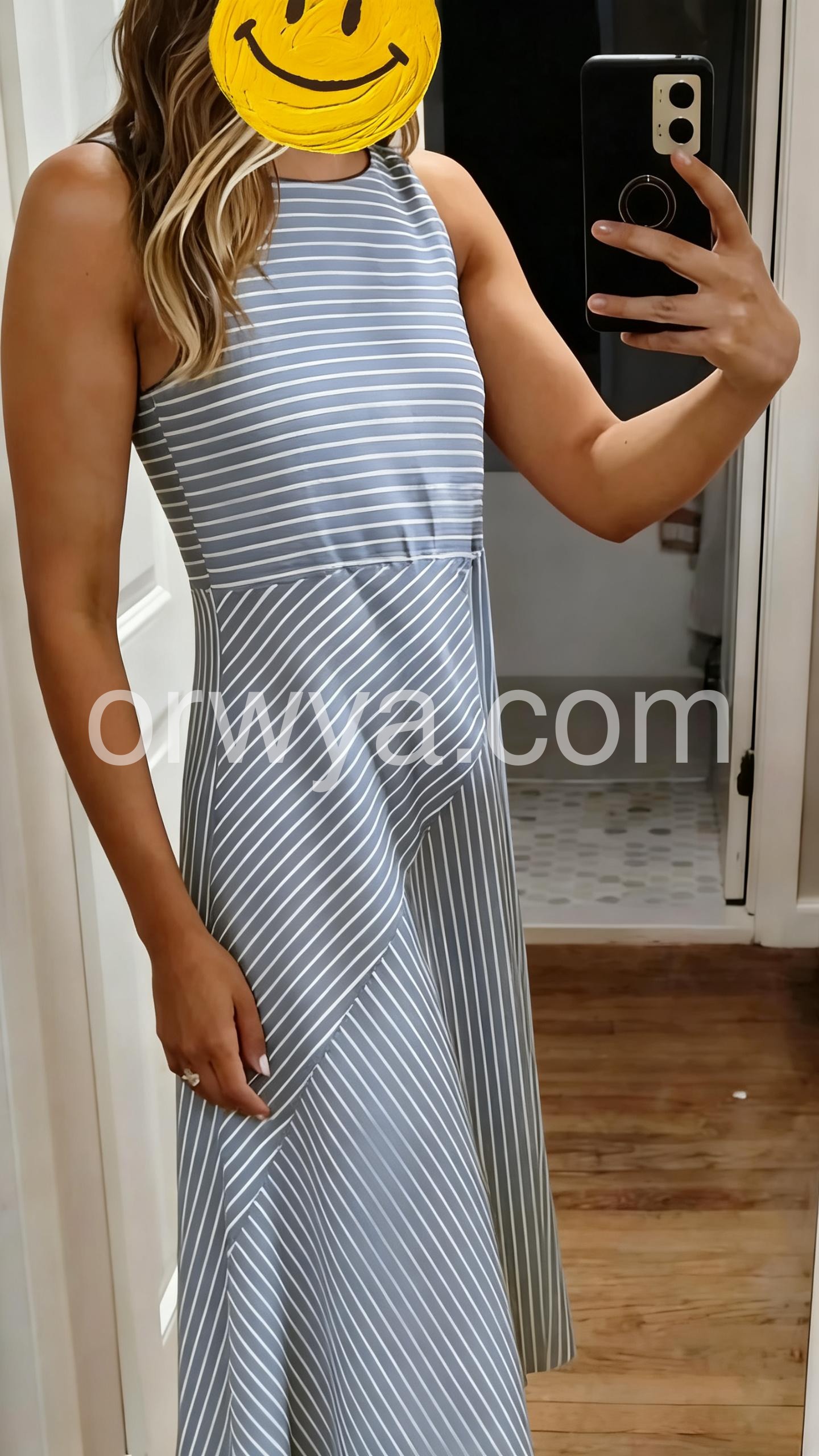 This sleeveless midi dress features a stylish blue and white striped pattern. The asymmetrical hem adds a contemporary touch. Fitted waist enhances the silhouette. Lightweight fabric perfect for summer or resort wear. Ideal for casual outings or daytime events.