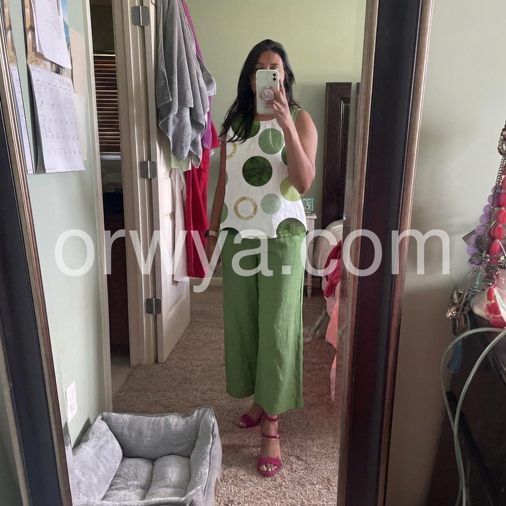 This coordinated set features a sleeveless top with bold green polka dots on a white background. Paired with solid olive-green wide-leg pants for a clean, contemporary look. Lightweight and comfortable fabric ideal for everyday wear. Perfect for casual outings or relaxed summer days. Stylish and easy to style.