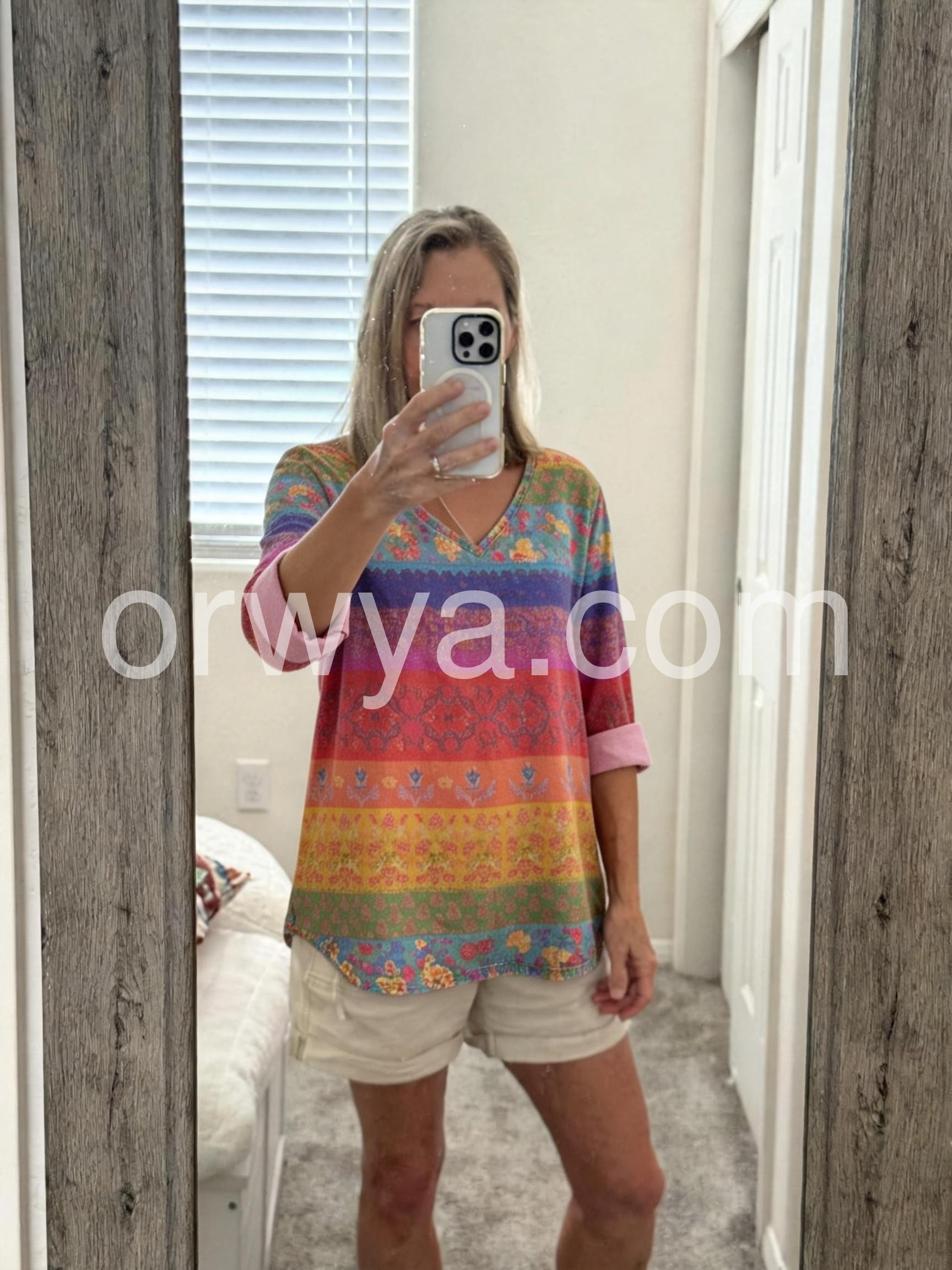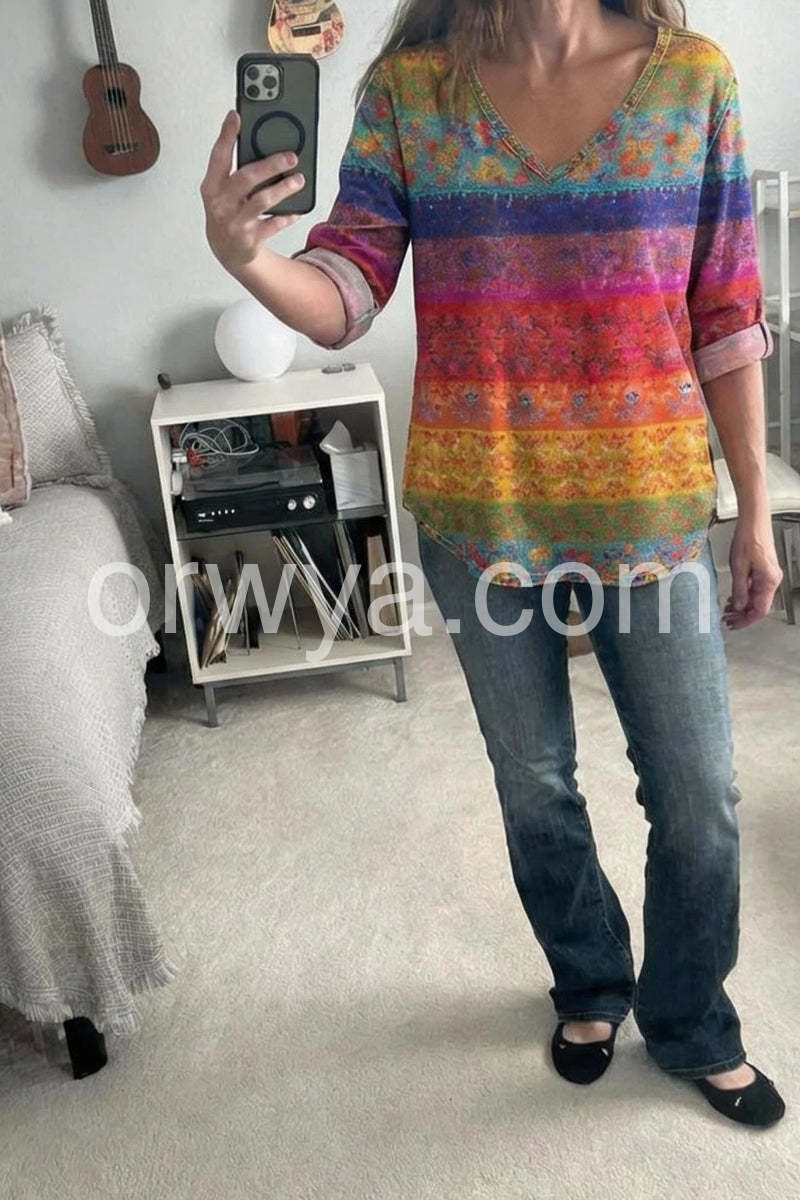 Step into a world of color and culture with this Vibrant Boho Print Multicolor Top, a bold and artistic piece that celebrates global inspiration with every stitch. Crafted from soft, lightweight fabric—likely cotton or rayon blend—this tunic features a stunning horizontal stripe pattern in rich hues of purple, magenta, orange, yellow, teal, and green, each adorned with intricate floral and tribal motifs reminiscent of traditional Mexican or South Asian textiles. The deep V-neckline adds a touch of elegance and femininity, while the relaxed, oversized silhouette drapes beautifully for ultimate comfort. Three-quarter sleeves with rolled cuffs enhance its laid-back charm, making it perfect for pairing with jeans, leggings, or flowy pants.