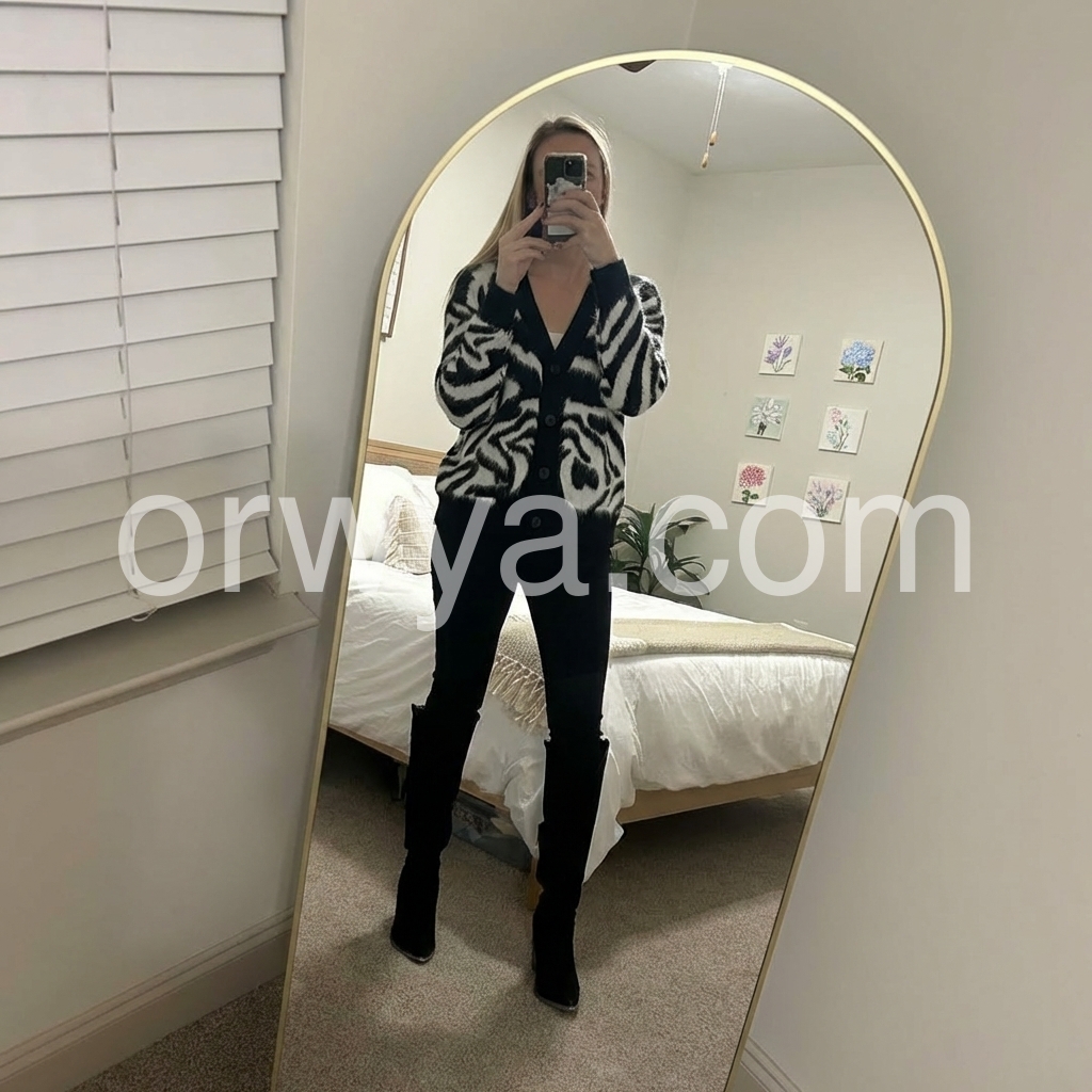 Elevate your wardrobe with this bold zebra-print knit cardigan crafted from a luxurious soft mohair blend. Its distinctive pattern adds a striking visual contrast, while the mohair fibers ensure lightweight warmth and a plush texture. Designed for both style and comfort, this cardigan is ideal for layering during transitional seasons, providing a sophisticated yet edgy statement piece to your collection.