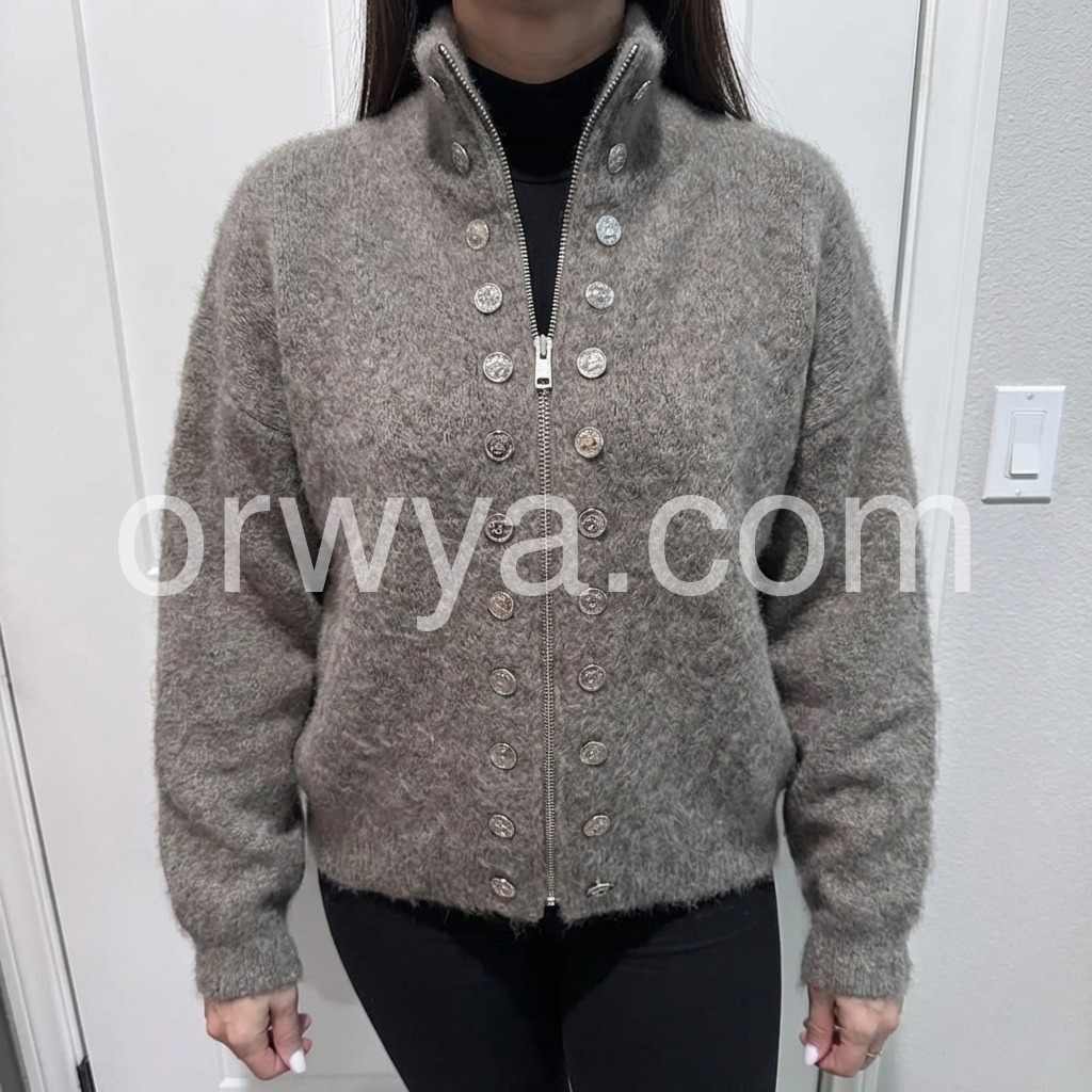 The Fuzzy Grey High Neck Long Sleeve Cardigan is a cozy and stylish addition to any wardrobe. Made with a high neck and long sleeves, it provides warmth and comfort during colder months. The fuzzy texture adds a touch of softness and style, making it a versatile piece for any outfit.