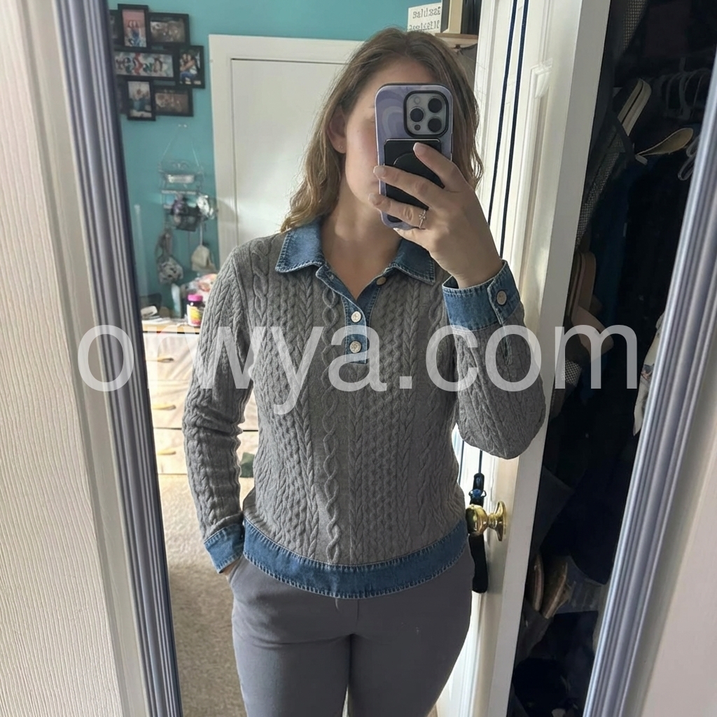 Elevate your casual wardrobe with this sophisticated grey cable knit sweater, featuring a distinctive denim collar that bridges classic and contemporary style. The intricate cable pattern adds textural depth and visual interest, while the long sleeves provide warmth and versatility for layering. Crafted with attention to detail, this piece transitions seamlessly from weekend wear to smart-casual settings, offering the comfort of premium knitwear with refined aesthetic appeal.