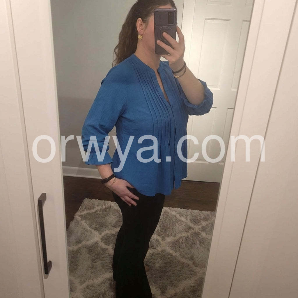 Discover timeless sophistication in this Deep Blue Pleated Button Down Blouse, a beautifully designed top that combines comfort, structure, and feminine flair. Crafted from lightweight, breathable fabric—likely a cotton or linen blend—this long-sleeve blouse features a rich sapphire blue hue that exudes confidence and style. The front is adorned with vertical pleats that add dimension and elegance, while the deep V-neckline offers a flattering touch of allure. A row of matching buttons runs down the center, enhancing the clean, tailored look. The sleeves are finished with gathered cuffs that create a soft ruffle effect when rolled up, adding subtle charm to the silhouette. The peplum hem gently flares out, creating a balanced, hourglass-inspired shape that pairs perfectly with high-waisted pants, skirts, or jeans. Ideal for casual outings, office wear, or weekend brunches, this blouse effortlessly transitions from day to night. Inspired by the curated, minimalist-chic styles found on Lulus.com, it’s a versatile wardrobe essential that brings effortless elegance to any ensemble. A must-have for those who love refined details and classic fashion with a modern twist.