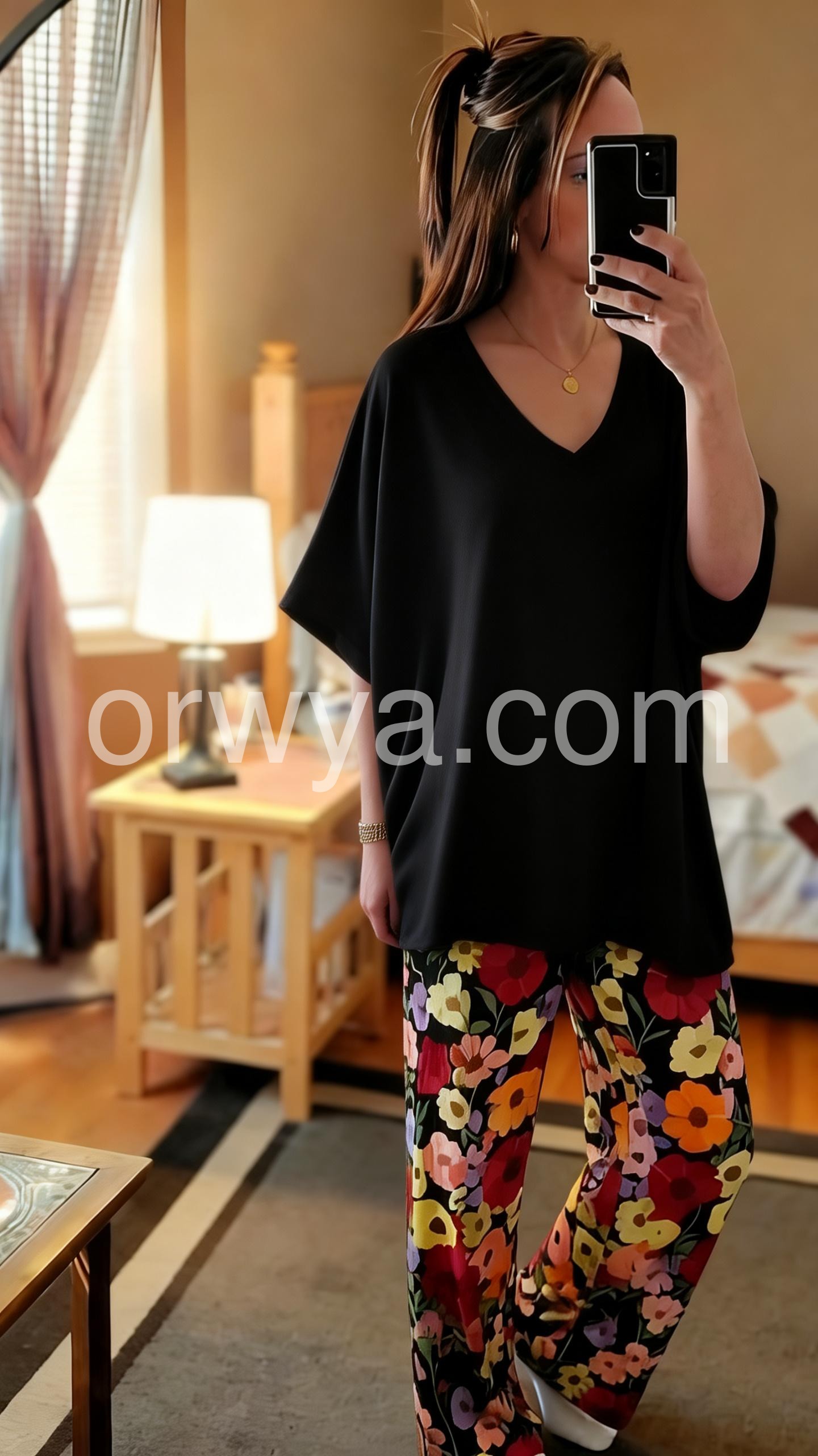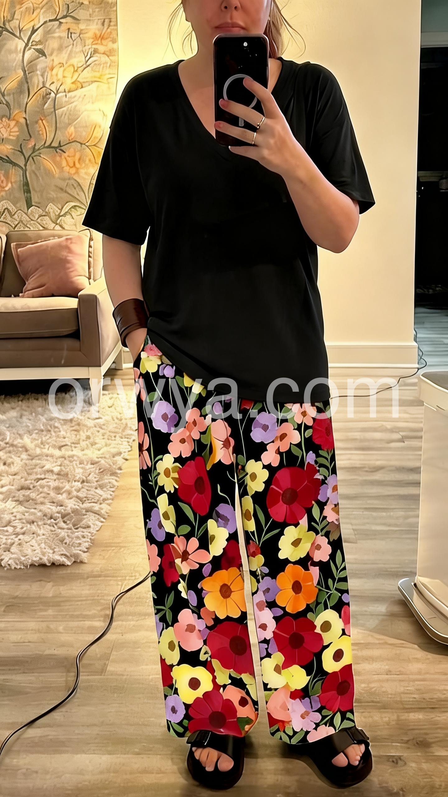 This coordinated set features a loose-fitting black V-neck top and wide-leg pants with colorful floral prints. The contrast creates a lively, eye-catching look. Lightweight fabric perfect for warm days. Ideal for casual outings or relaxed summer wear. Comfortable and effortlessly stylish.
