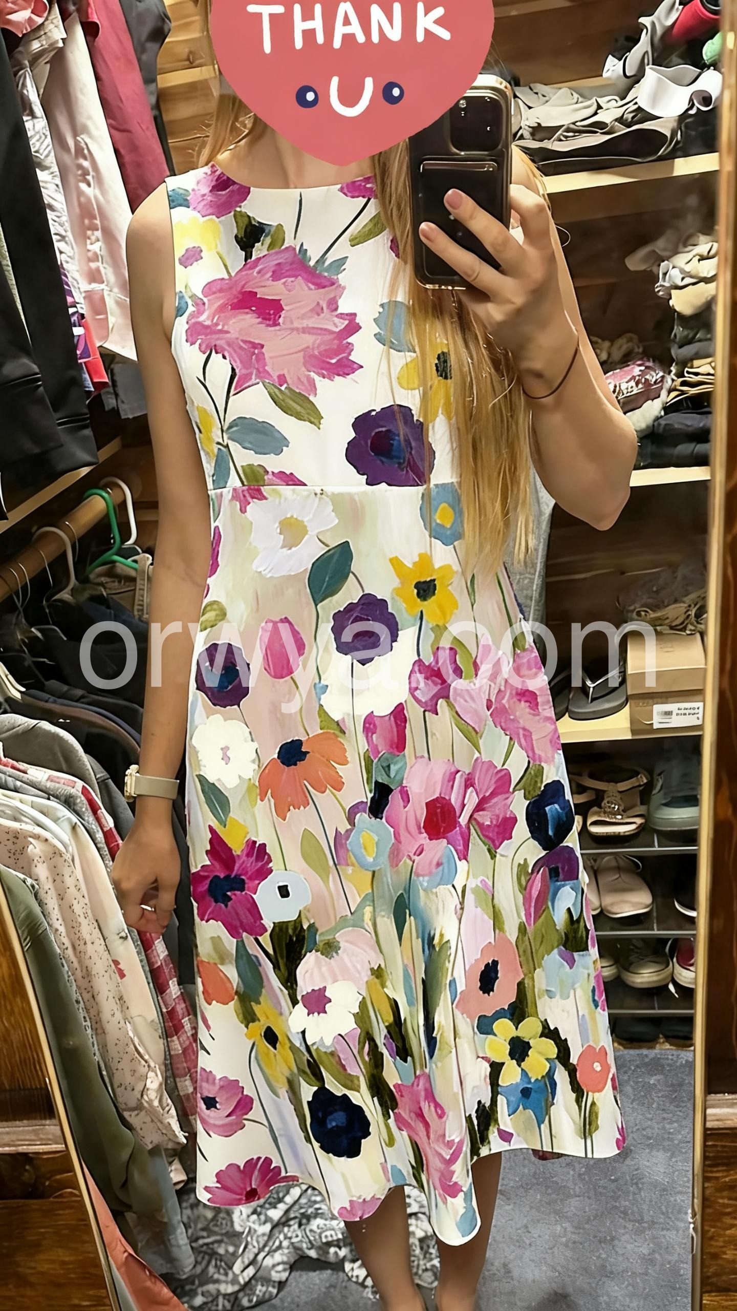This sleeveless midi dress features a vibrant watercolor floral print on a white base. The round neckline and flowy silhouette add elegance. Perfect for summer days or garden parties. Lightweight fabric for comfort and ease. Ideal for beach outings or casual events.